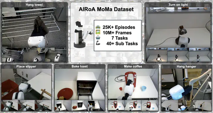 AIRoA MoMa Dataset OverviewAs robots transition from controlled settings to unstructured human environments, building generalist agents that can reliably follow natural language instructions remains a central challenge. Progress in robust mobile manipulation requires large-scale multimodal datasets that capture contact-rich and long-horizon tasks, yet existing resources lack synchronized force-torque sensing, hierarchical annotations, and explicit failure cases. We address this gap with the AIRoA MoMa Dataset, a large-scale real-world multimodal dataset for mobile manipulation. It includes synchronized RGB images, joint states, six-axis wrist force-torque signals, and internal robot states, together with a novel two-layer annotation schema of sub-goals and primitive actions for hierarchical learning and error analysis. The initial dataset comprises 25,469 episodes (approx. 94 hours) collected with the Human Support Robot (HSR) and is fully standardized in the LeRobot v2.1 format. By uniquely integrating mobile manipulation, contact-rich interaction, and long-horizon structure, AIRoA MoMa provides a critical benchmark for advancing the next generation of Vision-Language-Action models. The first version of our dataset is now available at this https URL.